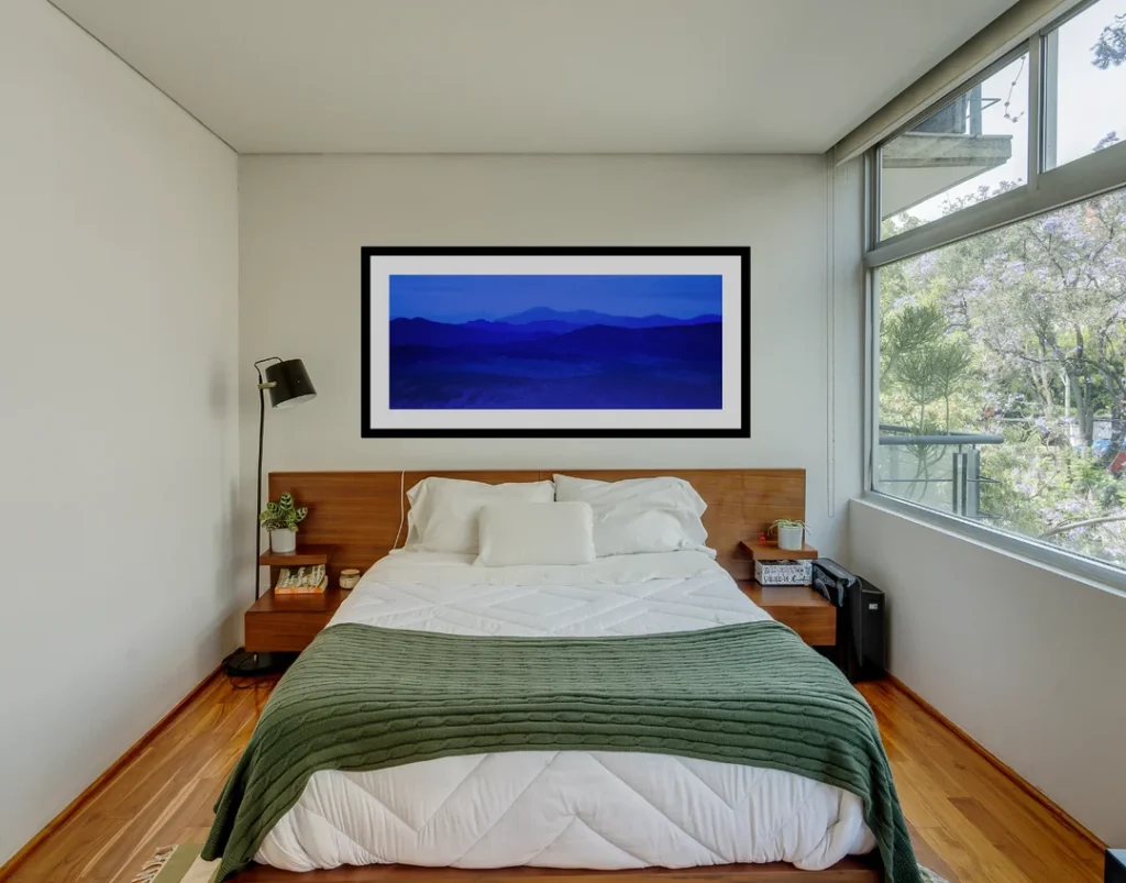 Multiple small pieces of wall art can make a room feel busy. Instead, go for one large statement piece above the bed or on a focal wall.