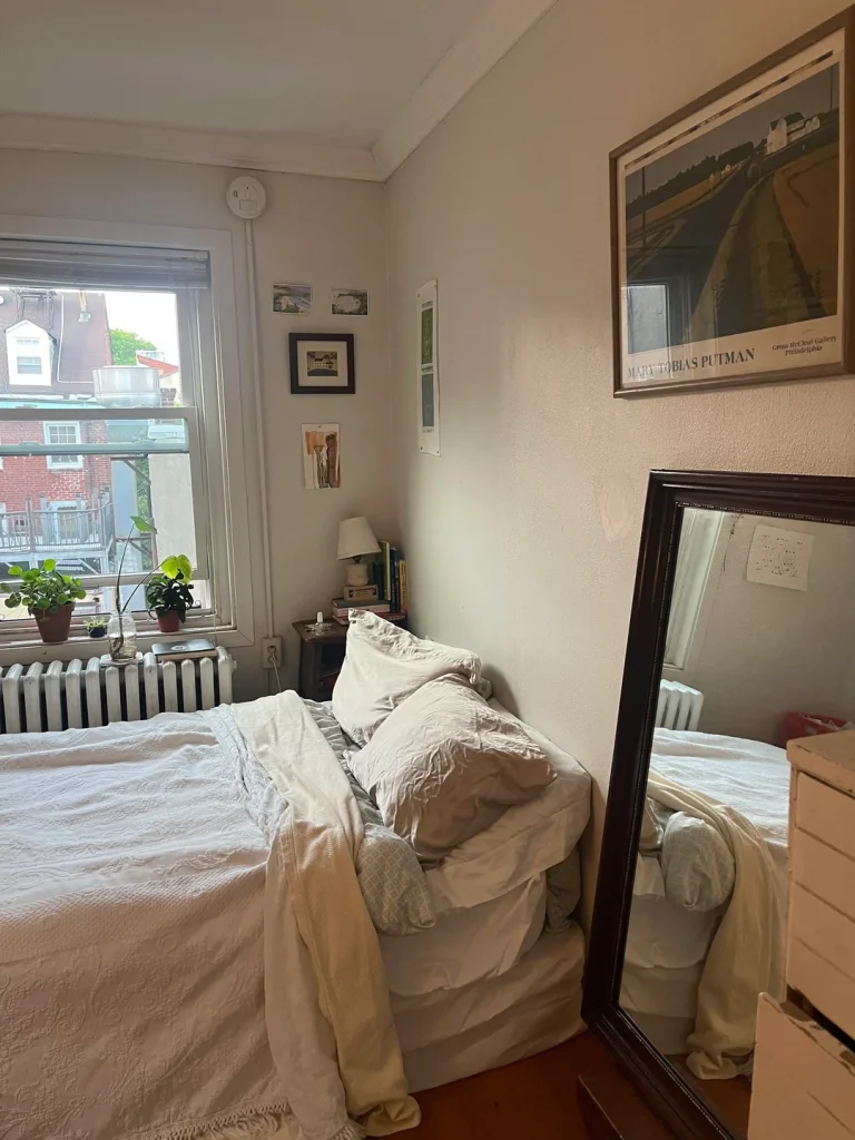 A full-size or queen bed often works best for small bedrooms. Pair it with a simple bed frame, such as a platform bed or one with legs, to avoid making the room look bulky.