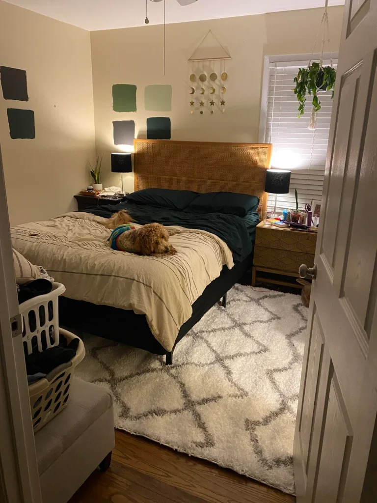 If your bedroom doubles as a work area, use a smaller rug under the desk to define that zone. Rugs also add warmth, color, and texture without taking up physical space.