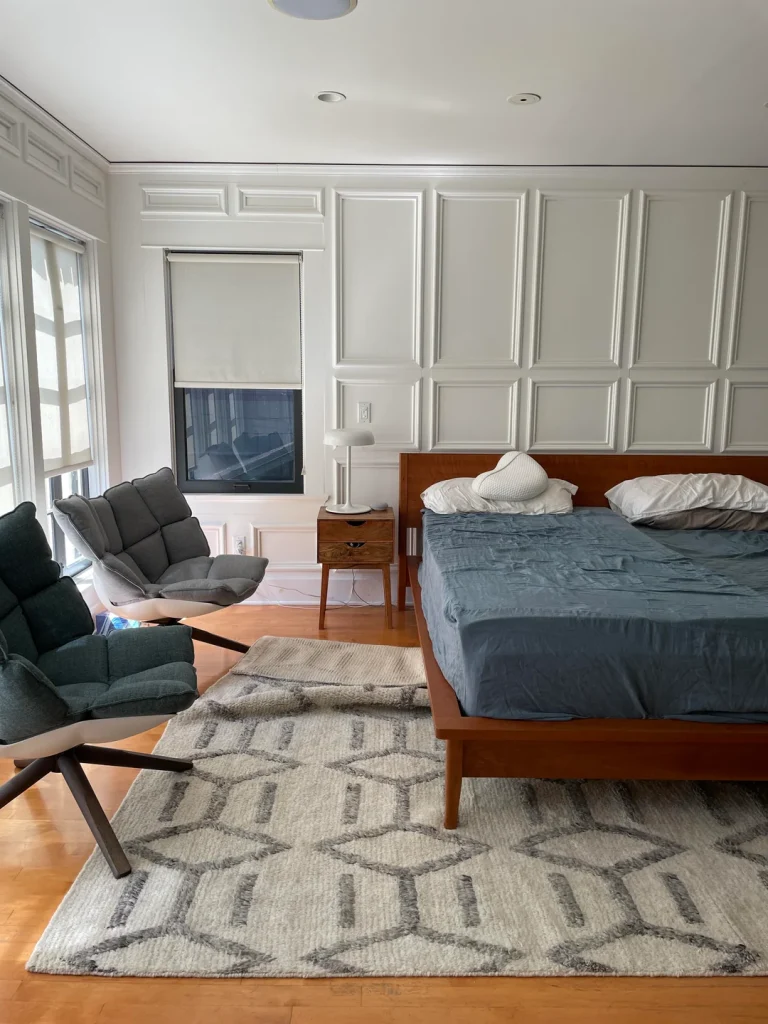 A small bedroom doesn’t always have space for extra furniture, but a well-placed rug can help define areas within the room.