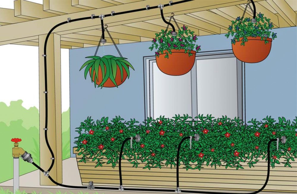 Drip irrigation is especially useful for outdoor hanging plants that dry out quickly in the sun and wind.